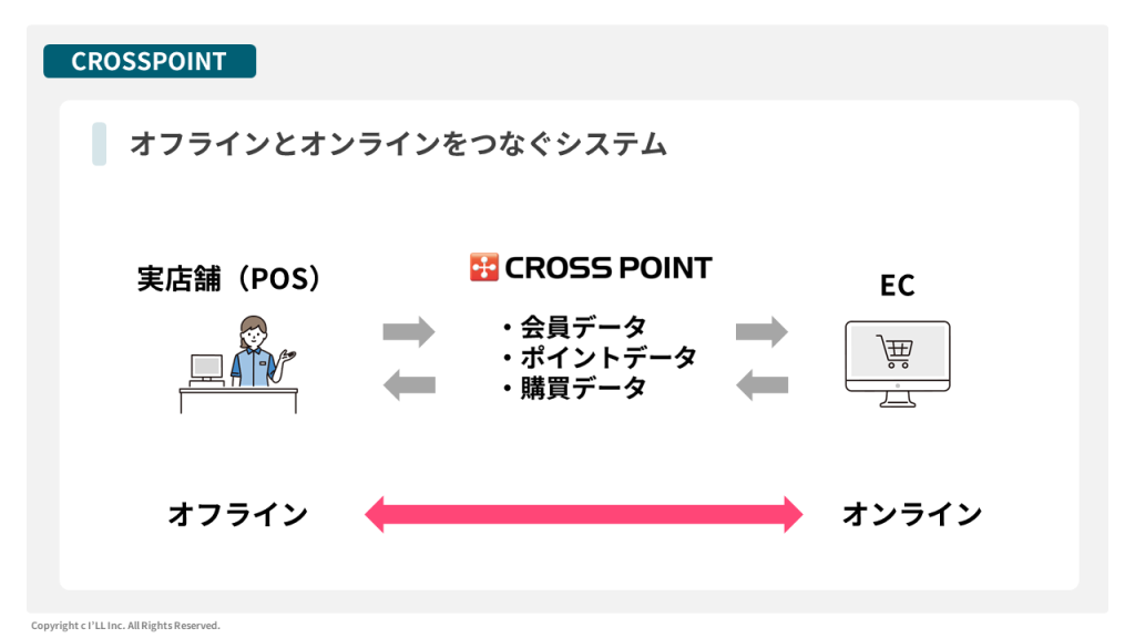 当社が提供する「CROSS POINT」は、実店舗とECサイトのポイント・顧客情報一元管理クラウドサービスです。複数チャネルを横断した販促設計や、ファン顧客との接点機会の創造施策を支援しています。