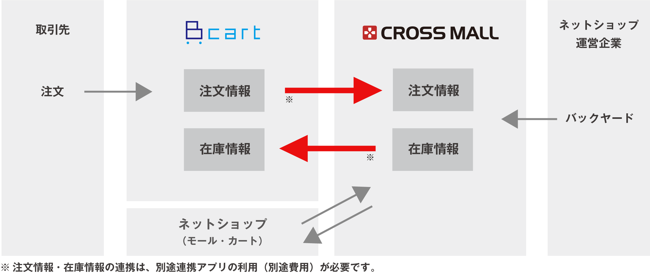 このたびの連携により、「Bカート」を利用し複数ネットショップを展開している企業は、「CROSS MALL」が管理している注文情報を反映することで、随時更新されている在庫数を「Bカート」の在庫数と共有することが可能となり、在庫を一元管理できます。また、売り残しリスクを軽減した商品の出品が可能となるため、業務効率化だけではなく、販売促進にもつなげることができます。「Bカート」に出店されていないネットショップ運営企業には、業務の変更なしに新たな販路を検討できる連携となります。