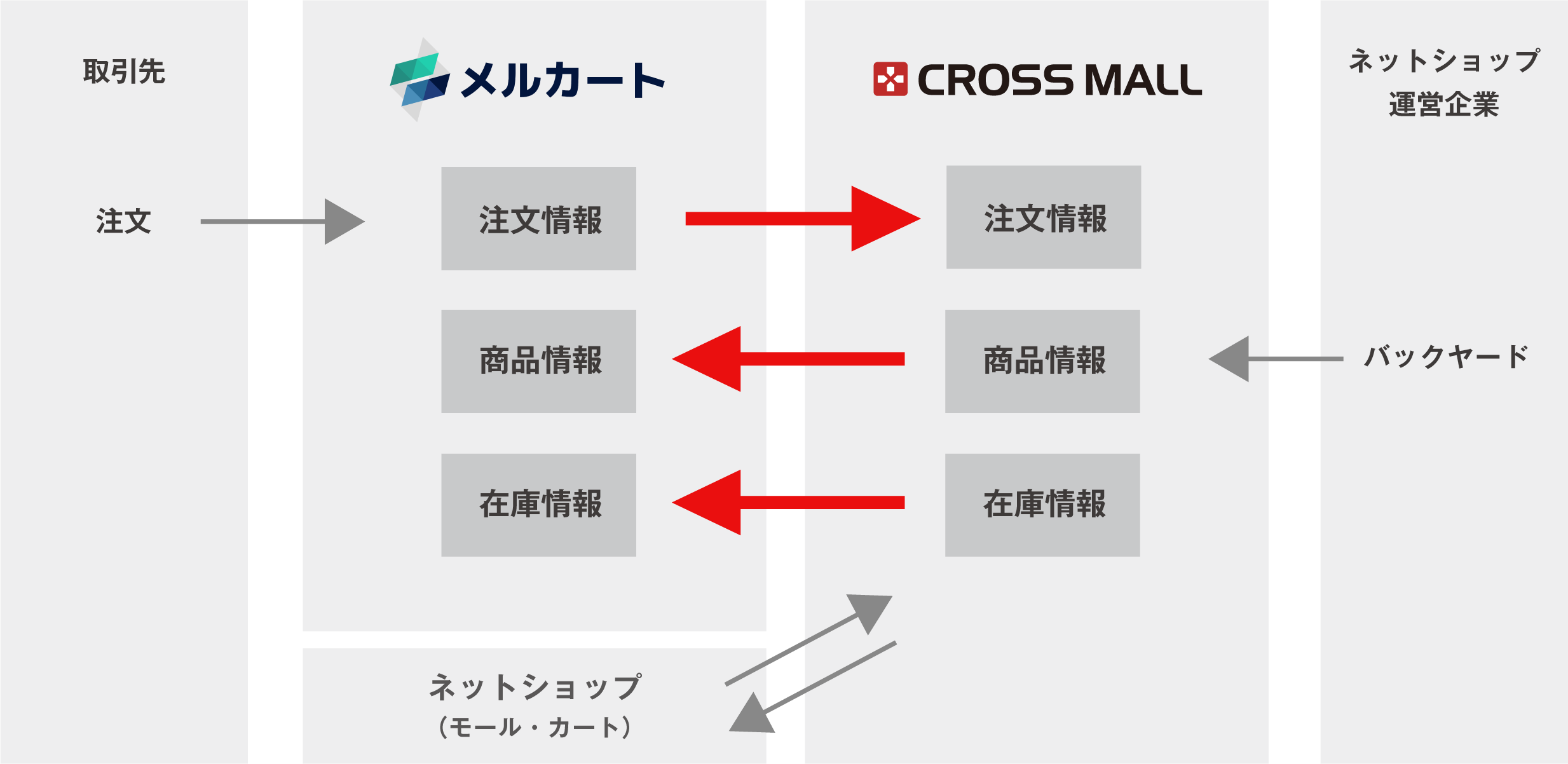 このたびの連携により、「CROSS MALL」にて管理している自社在庫数と商品・画像情報を、「メルカート」へ連携可能になります。そのため、「CROSS MALL」を利用されている企業さまは、他のECモール・ECカートと同様に、在庫数・商品情報を一括で更新・登録できます。また、注文情報の連携も可能なため、他のECモール・ECカートと同様に、注文・出荷処理を一元管理できます。EC運営企業のコストや管理負荷を抑えた、複数のECサイト出店を支援します。「メルカート」を利用されていない企業さまには、業務の変更なしに新たな販路を検討できる連携となります。