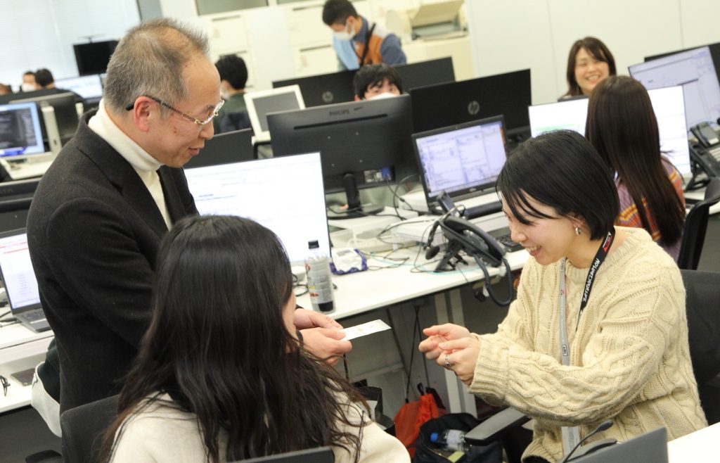 役員から社員に、メッセージカード入りのポチ袋をサプライズで手渡し