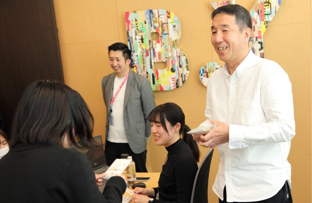 役員それぞれからスピーチ後、全社員に向けた手書きのメッセージカードを同封したポチ袋を、サプライズで手渡しに周りました。驚きと感謝が飛び交うあたたかい場となりました。