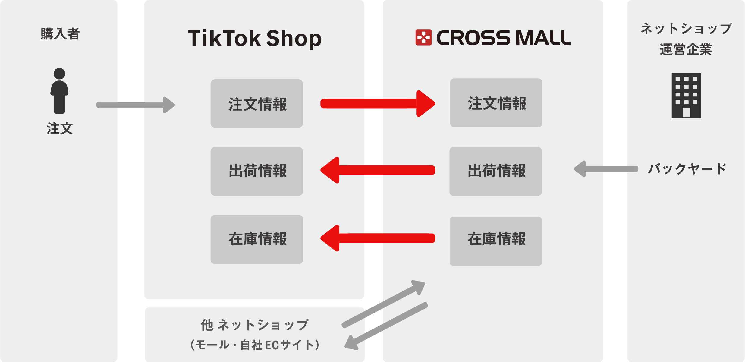 このたびの連携により、既に「TikTok Shop」に出店されており複数のネットショップを展開している企業さまは、「CROSS MALL」で注文情報の一元管理が可能となり、随時更新されている在庫数を「TikTok Shop」と共有することで在庫の一元管理も可能となります。また、「CROSS MALL」から「TikTok Shop」へ、出荷完了報告の自動連携も可能となり、業務効率化につながります。「TikTok Shop」に出店されていないネットショップ企業さまには、業務の変更なしに新たな販路を検討できる連携となります。